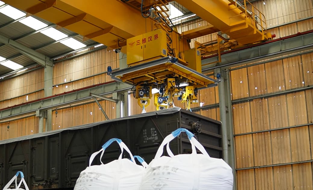 - 機械執(zhí)行:輸送機將噸袋送至抓取工位,吊裝系統(tǒng)按預(yù)設(shè)程序精準抓取并碼放至車廂指定位置,叉齒設(shè)計可保護噸袋并整形垛型。
