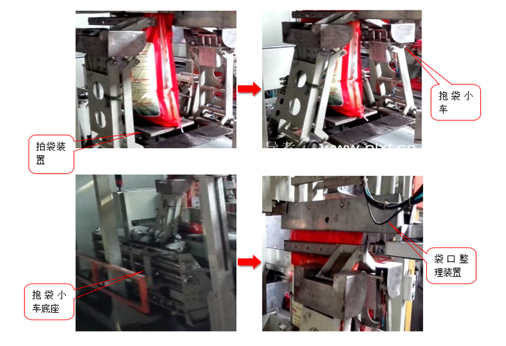 定量包裝機下料灌裝的過程中,底部的拍袋裝置啟動,確保袋內(nèi)物料充填緊密。灌裝結(jié)束后拍打停止,下料口夾袋裝置打開,充填物料后的包裝袋在下料口放下的同時,由送包小車經(jīng)專門加工的用于粉體、顆粒物料料袋的抱包、夾包裝置將料袋中部抱住,袋口夾住,送至活動導(dǎo)入裝置,活動導(dǎo)入與熱合縫包一體機系統(tǒng)相連.經(jīng)其進入封口傳動鏈中,保證袋口成一字形。在導(dǎo)入器附近增加吸塵口,通過與除塵系統(tǒng)連接可吸走夾住袋口時飛出的粉塵.